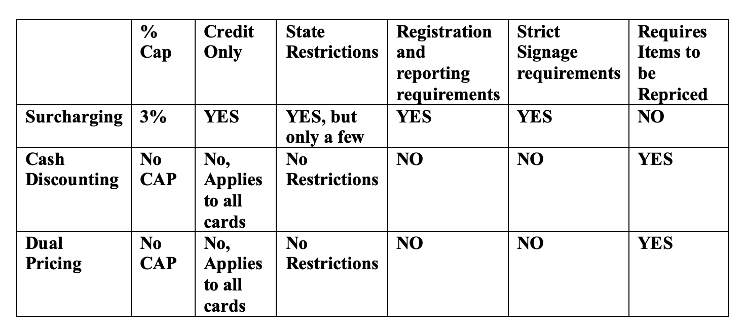 Surcharging vs Cash Discount vs Dual Pricing at a glance: